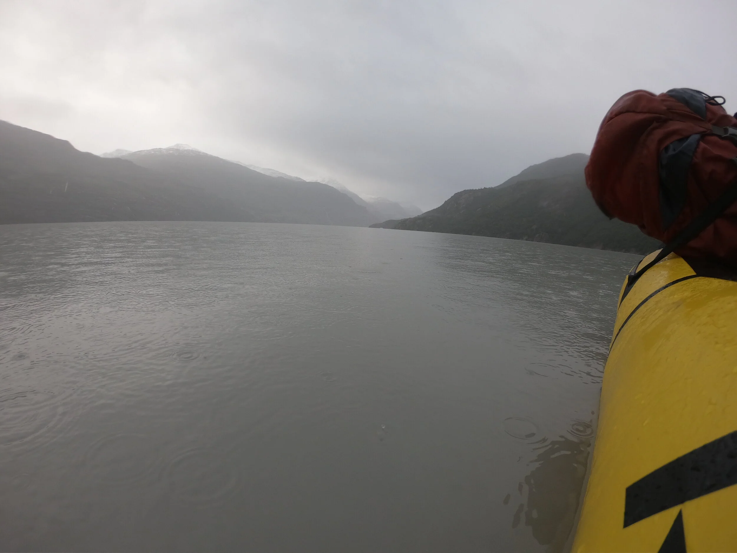 The morning rain had soaked me though the rain jacket and the “semi-dry top” and I had to keep moving with the boat to avoid getting hypothermic. I thought of setting up the tent to warm up but the winds just picked up so it was best to keep moving. A 6 year old military refugio was a great short break from the wind but it was in no condition for overnight stay. It said that this valley is called “Pyramid Valley” and I can see why.