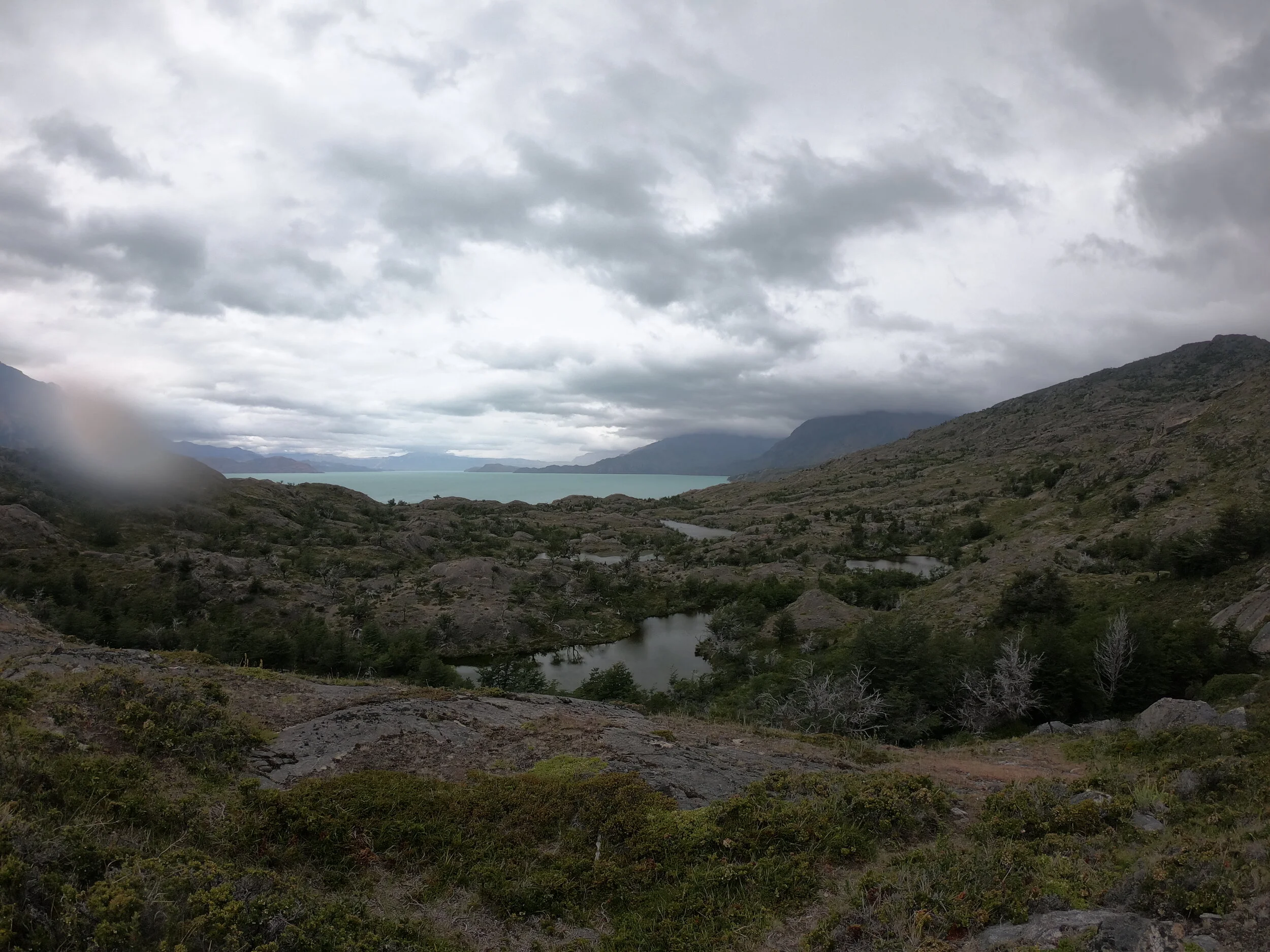 Over the pass I get a view of Lake Chico and my possible route. There seems to be a clogged up passage before the glacier and it is unlikely I could portage around this.