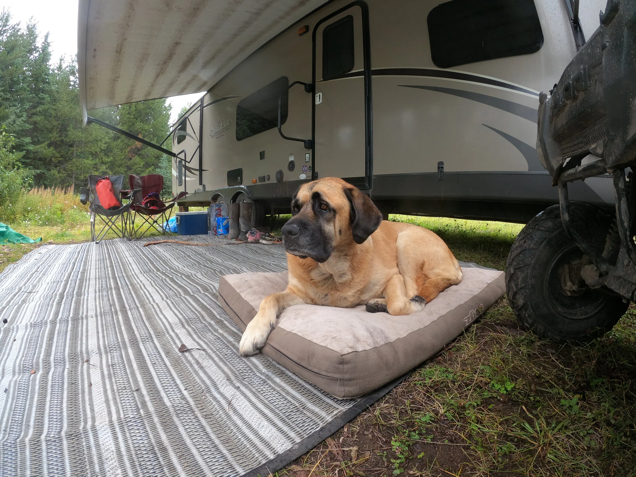 even the great canadian dogs knew better than to run around in the rain. No need to be a wet dog when you have your own bed and RV porch :)