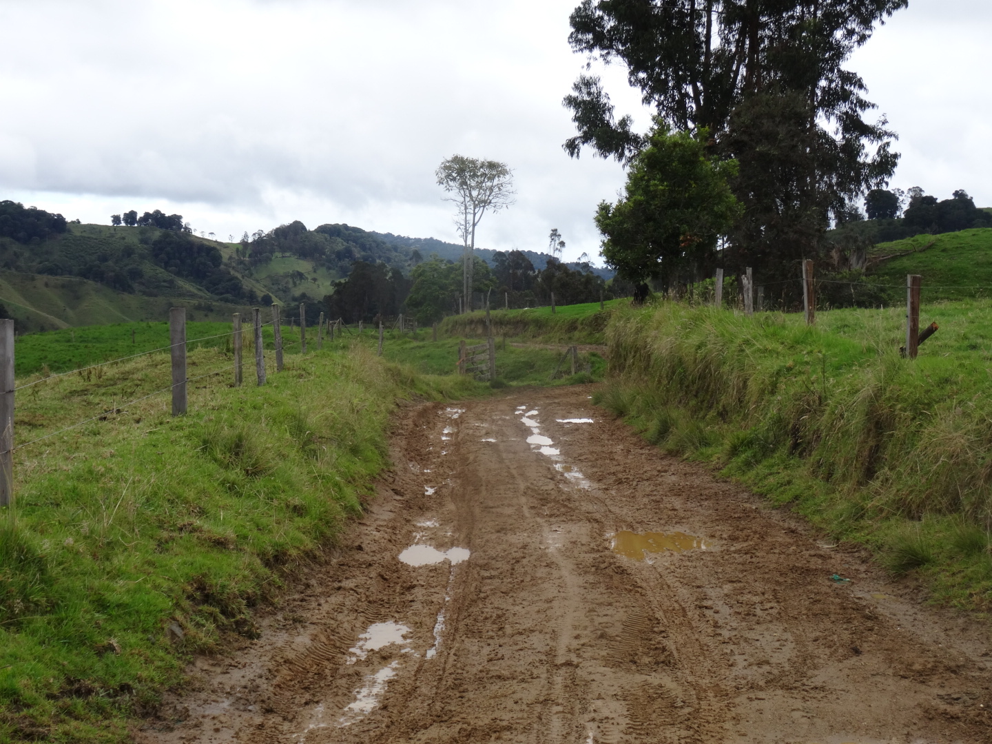 It was a brake burning and fun descend and it took a while until I could wipe that smile off my face. Leaving Santa Rosa de Cabal the rain cauht up to me so I waited under a roof with two dogs, two cats and Marian who was walking her dog. Poor little beast is half rage and half shaking and does not keep an eye on his food.